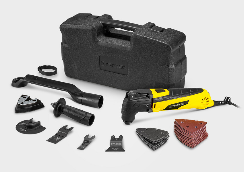 Lijadora Delta, sierra para madera y metal, amoladora, sierra de incisión, rascador – o sencillamente: PMTS 10‑230V. Con esta polifacética herramienta multifunción usted prácticamente necesita una única herramienta para todos los trabajos ya que Trotec le suministra la PMTS 10‑230V completamente equipada con un amplio número de accesorios, incluyendo la práctica maleta de transporte.
