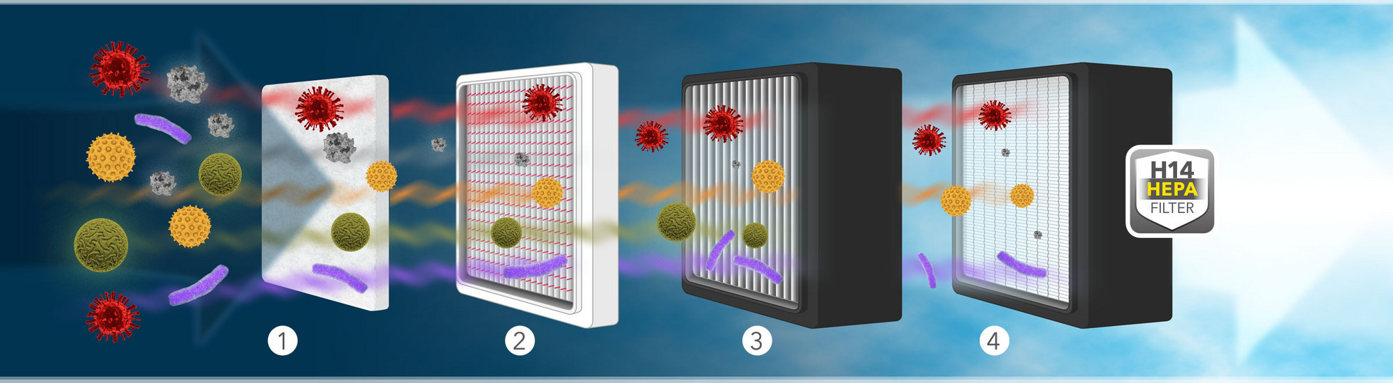 El impresionante capacidad de purificación del aire del AirgoClean® One se consigue exclusivamente mediante la tecnología de filtrado mecánico establecida. Estos filtros mecánicos se utilizan en muchas instalaciones de ventilación de edificios para una purificación eficaz del aire. Por eso también en el AirgoClean® One apostamos al 100 % por esta potente tecnología de purificación del aire. El AirgoClean® One no utiliza tecnologías alternativas como UV-C, ionización, tecnología de ozono o filtrado electrostático. En interiores, el HEPA-H14 consigue así un aire puro filtrado libre en un 99,995 % de sustancias nocivas peligrosas.