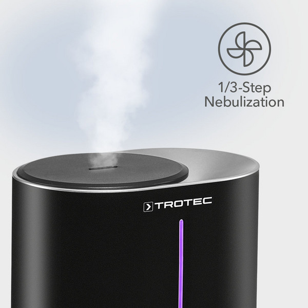 Y así funciona. El agua de grifo acumulada en el depósito de agua de 4 litros es transformada por ultrasonidos en una refrescante niebla pulverizada y distribuida por toda la habitación a través de la boquilla de nebulización. Los tres niveles de nebulización, incluyendo un modo automático controlado por higrostato, permiten una humidificación continua del aire hasta un máximo de 13 horas. Con su potente capacidad de nebulización de hasta 7,2 litros al día, el humidificador de diseño B 2 E se recomienda para su uso durante todo el año en viviendas modernas, oficinas, consultas médicas, instalaciones terapéuticas, guarderías y otros entornos comparables con habitaciones de hasta 30 m² o 75 m³ de tamaño.