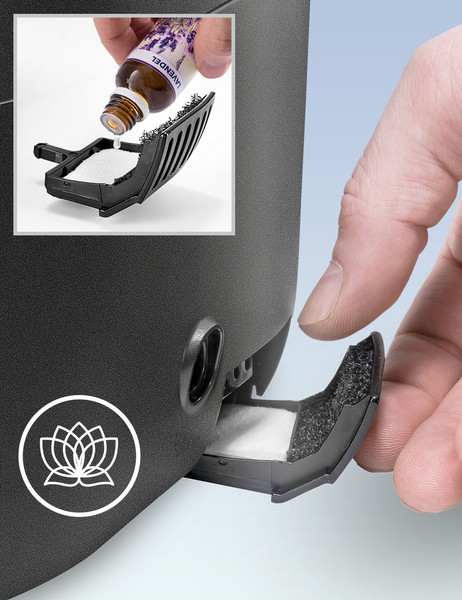 Depósito de aceite aromático: Al añadir aceites esenciales usted crea su propio oasis de bienestar. Los aromas adecuados aumentan la capacidad de concentración en el trabajo o le permiten entrar más suavemente en modo de tiempo libre cuando está en casa. Descubra la variedad de aromas para crear la atmósfera adecuada en cada caso.